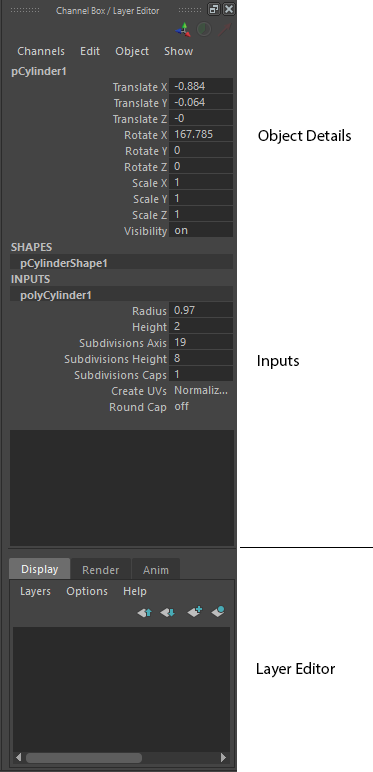 Im oberen Bereich findet man immer alle Eigenschaften des “Transform”-Node, also Translate, Rotate, Scale und Visibility. Der untere Bereich Input ist meistens zugeklappt, hier kann man die man die Konstruktions-Nodes des Objekts anpassen.