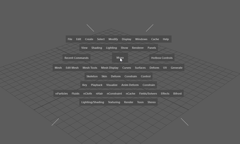 Die Hotbox enthält alle Funktionen von Maya, die mithilfe von Menüs erreicht werden können. Von oben nach unten findet man alle Menu Sets wieder: