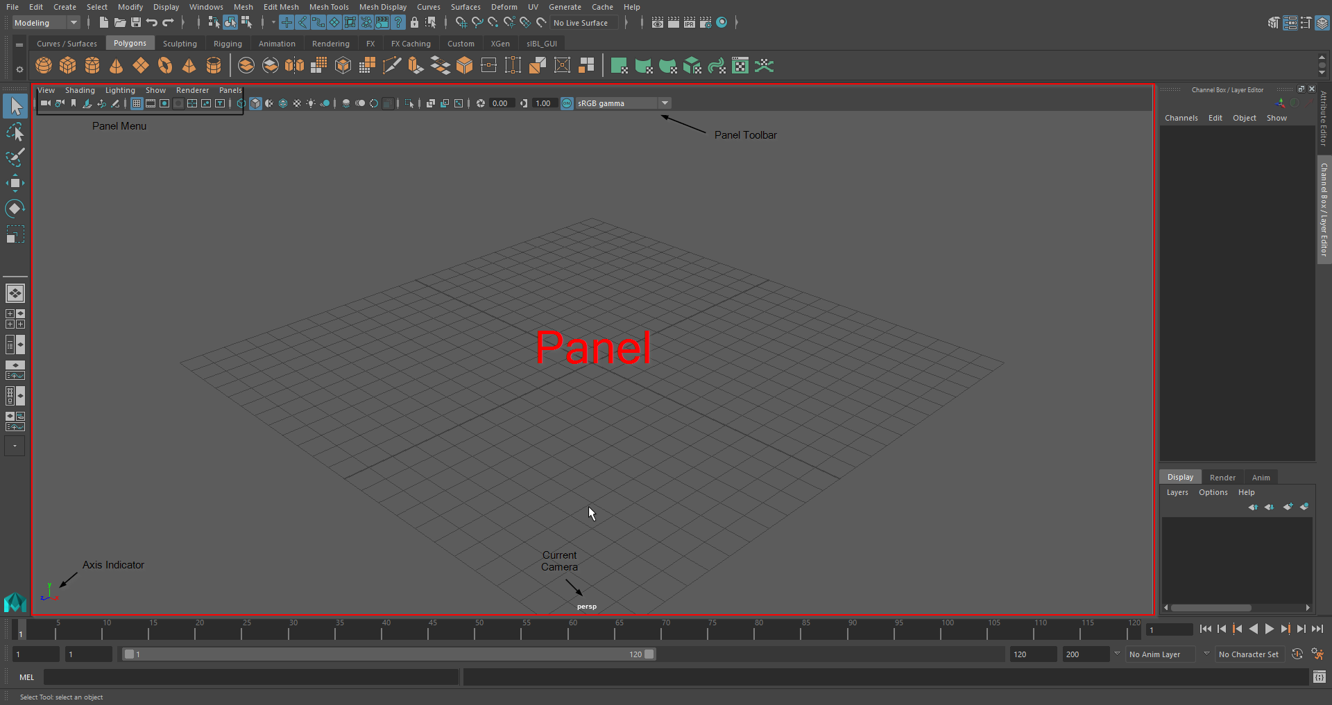 In dem Hauptpanel sehen wir einen leeren 3D-Raum. Damit wir uns orientieren können wird ein Hilfsgitter (Grid) eingeblendet. Wir schauen in die 3D-Welt mit der Kamera “persp”, sie hat eine 35mm Öffnung, was der natürlichen Wahrnehmung entspricht.