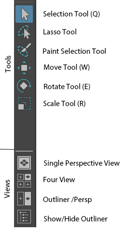 Der untere Bereich „Views“ bietet eine Auswahl verschiedener Panel-Views. Diese unterteilen den Bildschirm in mehrere Fenster um effizientere Workflows zu ermöglichen. Maya bietet hierzu einige vorgefertigte Panel-Layouts, wie die Four View.