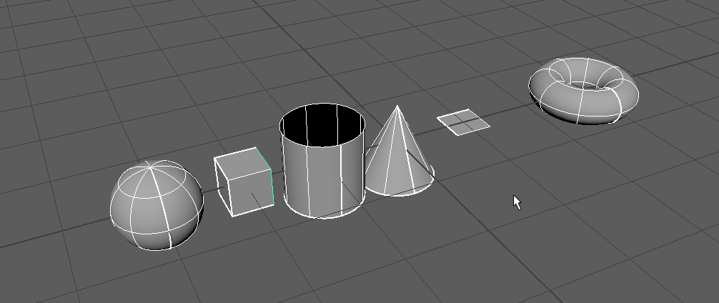 Wir erzeugen NURBS Primitive mit dem Menü . Dort findet man die Objekte Sphere, Box, Cylinder , Cone, Plane(Ebene) und Torus.