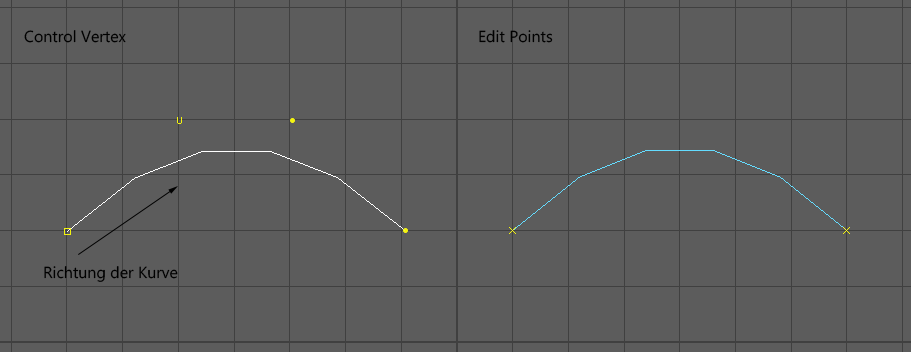 - EP-Curves: Beim Erstellen der Kurve werden die Edit Points gesetzt, es müssen mindestens zwei Punkte gesetzt werden damit eine Curve gezeichnet wird, es werden die CV Punkte automatisch generiert.