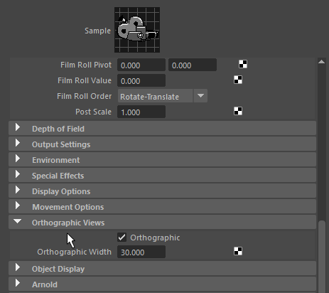 Um eine neue Orthographische Kamera zu erstellen, erstellt man zunächst eine perspektivische Kamera. Im Attribut Editor aktiviert man unter “Orthographic Views” > Orthographic.