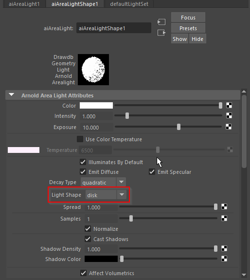 Das Ai Area Light erweitert das Maya Area Light mit dem Attribut “Light Shape”, mit diesem lässt sich die Form des Area Lights in eine Scheibe oder einen Zylinder (wie eine Leuchtstoffröhre) wechseln.