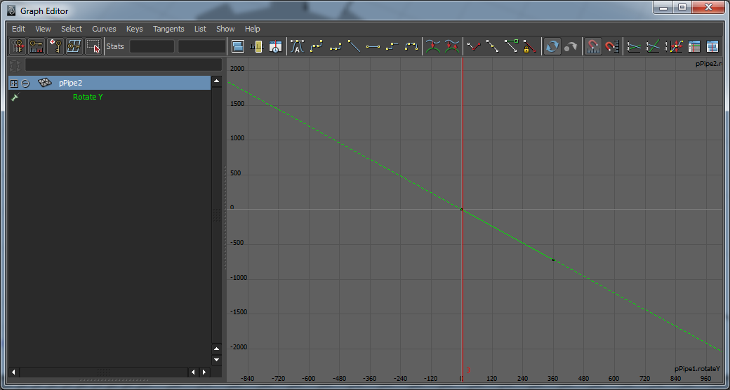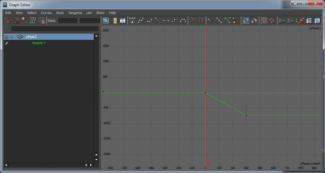 Das kleine Zahnrad (pPipe2) selektieren und den Graph Editor öffnen. Man sieht, es wurden Keyframes für den RotateY gesetzt.