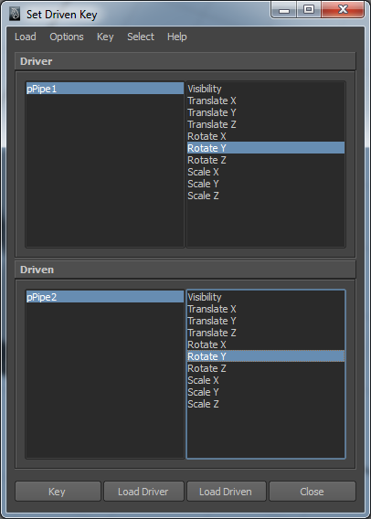 Das große Zahnrad (pPipe1) selektieren und im „Set Driven Key“-Fenster „Load Driver“