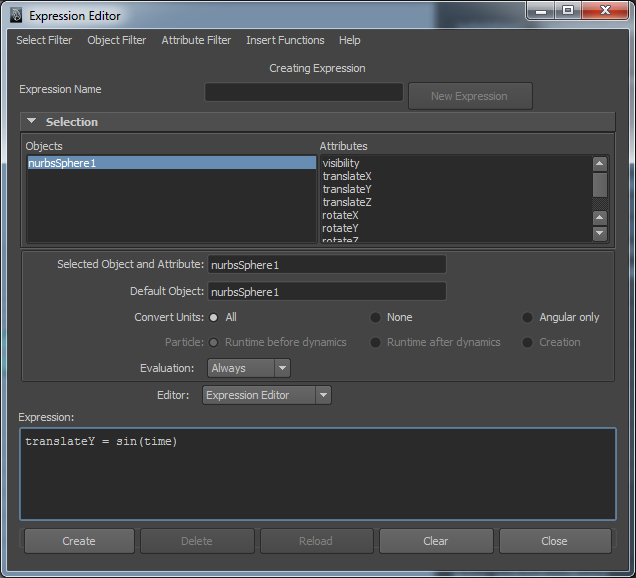 Das Attribut translateY selektieren und die Expression „translateY = sin(time)“ eingeben.